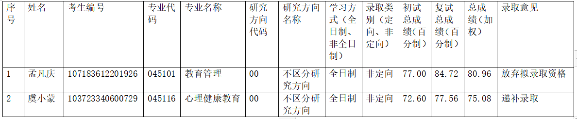根据学校2023年硕士研究生复试录取工作实施方案,结合学科专业发展需要和本专业一志愿考生复试录取结果,经学校招生工作领导小组研究同意,教育管理专业孟凡庆考生放弃拟录取资格,心理健康教育专业获得1名调配指标,按照考生总成绩由高到低排序递补拟录取虞小蒙考生为心理健康教育专业硕士研究生。