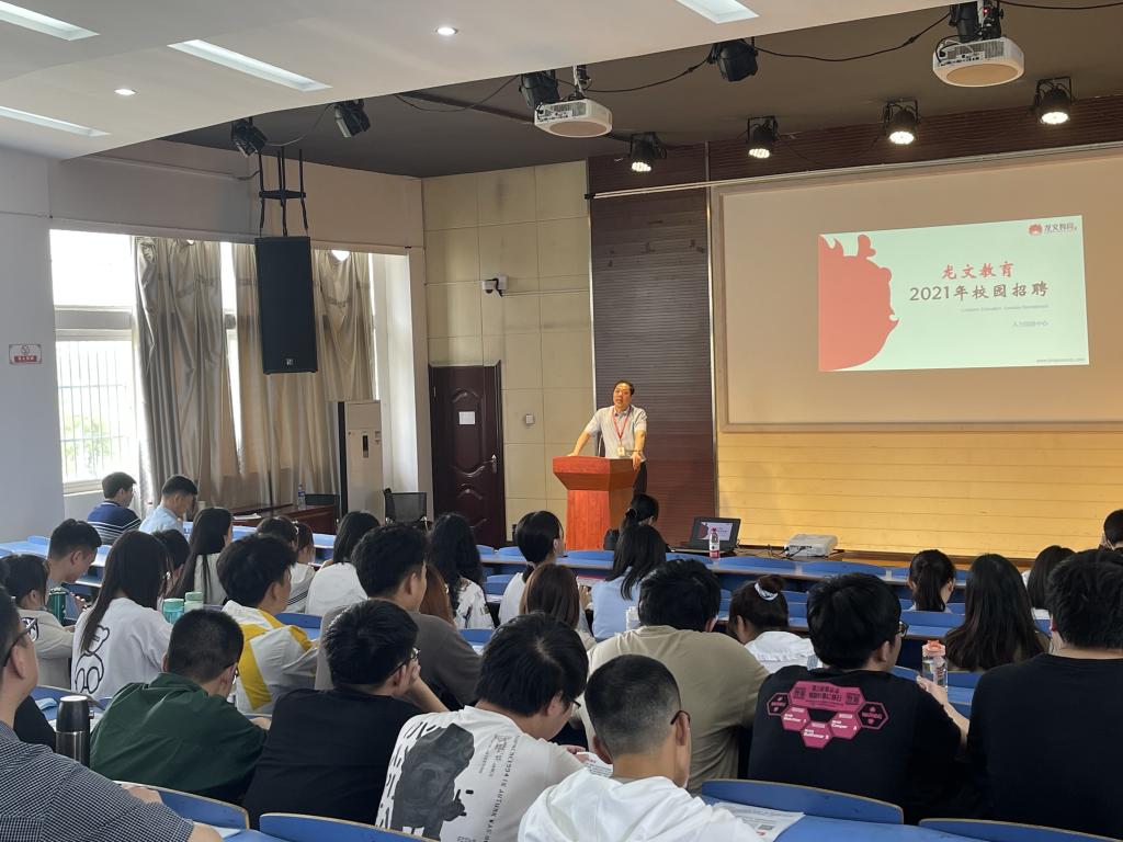 龙山校区D楼111教室举办了“潮职来袭,未来可期”专场招聘会,招聘会邀请了苏州龙文教育企业前来介绍岗位情况,教师教育学院党委书记陈志超、副书记许世平等领导和2017级及2018级近百名学生聆听了招聘会。