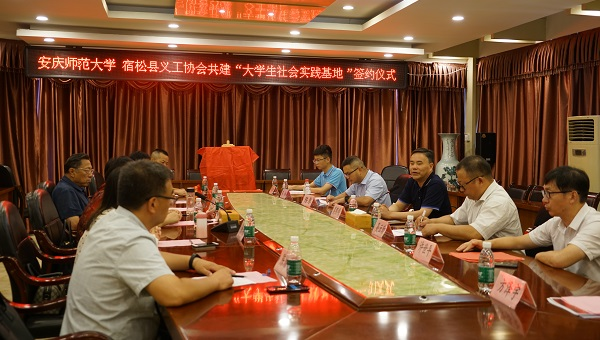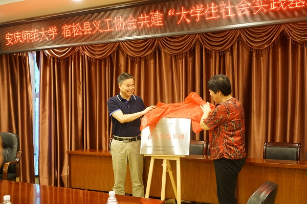 7月19日,安庆师范大学与宿松县义工协会共建“大学生社会实践基地”签约仪式在宿松县孚玉山宾馆举行。校党委副书记吴照明、宿松县政协副主席郭斯文出席仪式并揭牌。校团委书记陈东,学院院长吴云助,宿松县关工委、团委及义工协会负责人参加仪式。仪式由学院党委副书记许世平主持。