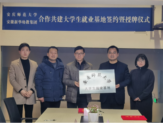 为进一步贯彻上级有关就业工作的文件精神,加强学校和用人单位的良性互动,促进共同发展。12月24日,安庆师范大学分别与安徽巧渡人力资源管理有限公司、安徽新华幼教集团有限公司举行大学生就业实习基地签约暨揭牌仪式。安庆师范大学教师教育学院党委副书记许世平、副院长王皓宇、就业秘书汪洋洋及安徽巧渡人力资源有限公司负责人宋凡、安徽新华幼教集团有限公司负责人吴敏志参加仪式。
