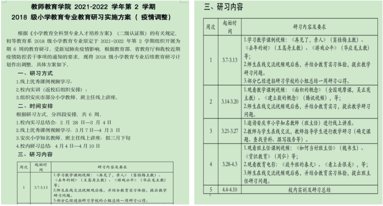 疫情暴发后,小教教研室反应迅速,第一时间制定了科学合理的线上研习方案。通过学习教学课例视频,观看班主任工作视频,观看教育类电影,师生在线交流视频观后感,主办“红色园丁大讲坛”,邀请安庆市小学知名语文和数学教师进行线上讲座,邀请优秀校友进行线上讲座、专家和学生进行线上互动交流等方式,用有质量的第二课堂引领学生的思想。