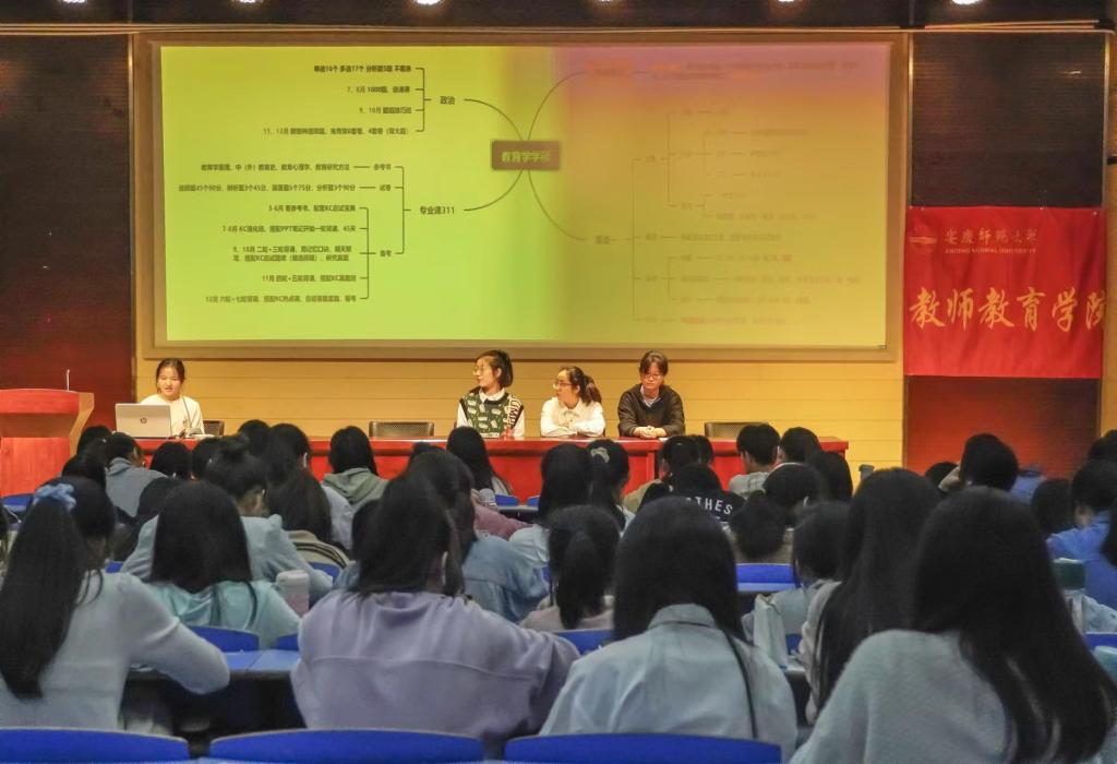 “复习时间怎么安排?”“备考期间心态不好怎么纾解?”……马诗音和潘纯纯针对学生们的疑惑给出了自己的见解。“将学习视作一种乐趣,保持良好的心态,循序渐进地攻破重难点。”马诗音以思维导图的方式分享了自己考研期间的时间安排,告诉学生们需要学会合理规划时间,适当放松自己。“归源于书本,扎牢自己的根。”潘纯纯结合自身经验教训告诫学生们需要拒绝“躺平”。她表示考研是一场持久战,需要将学习日常化,养成学习的习惯,才能走向彼岸。