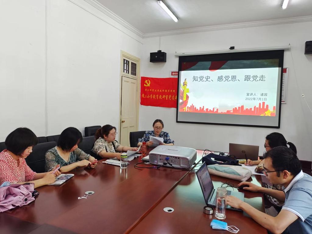 为热烈庆祝中国共产党建立101周年,7月1日上午,教工小学教育教研室党支部在菱湖校区红楼二楼会议室开展《知党史,感党恩,跟党走》专题党课学习活动,党课由支部书记诸园主讲。