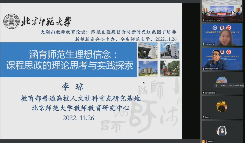 11月26日,教育部普通高校人文社会科学重点研究基地北京师范大学教师教育研究中心常务副主任、北京师范大学教育学部博士生导师李琼教授,应邀在线上作了题为“涵育师范生理想信念:课程思政的理论思考与实践探索”的学术报告。报告会由快猫