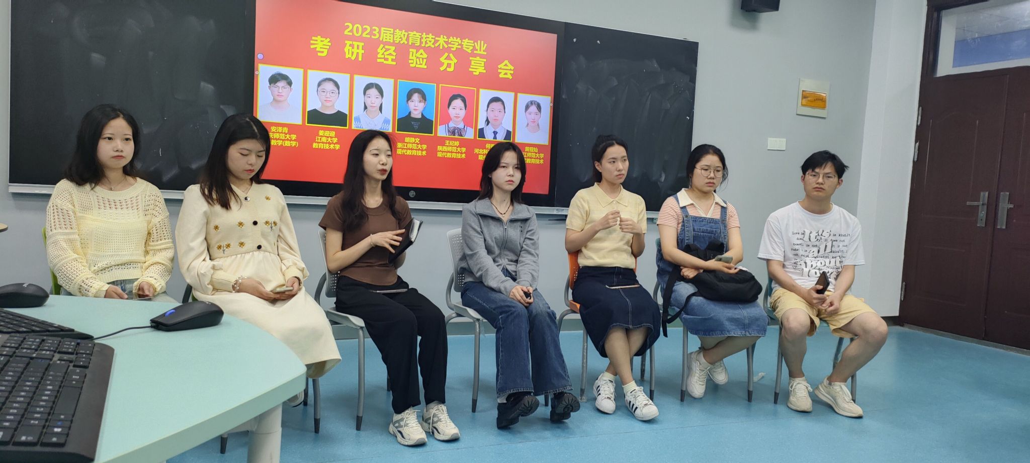 教育技术系在D206教室举行考研经验分享交流会。会议邀请2019级教育技术学专业七名拟录取研究生的同学作考研经验分享,活动吸引了2020级、2021级、2022级共70余名学生参与。活动由韦伟老师主持。