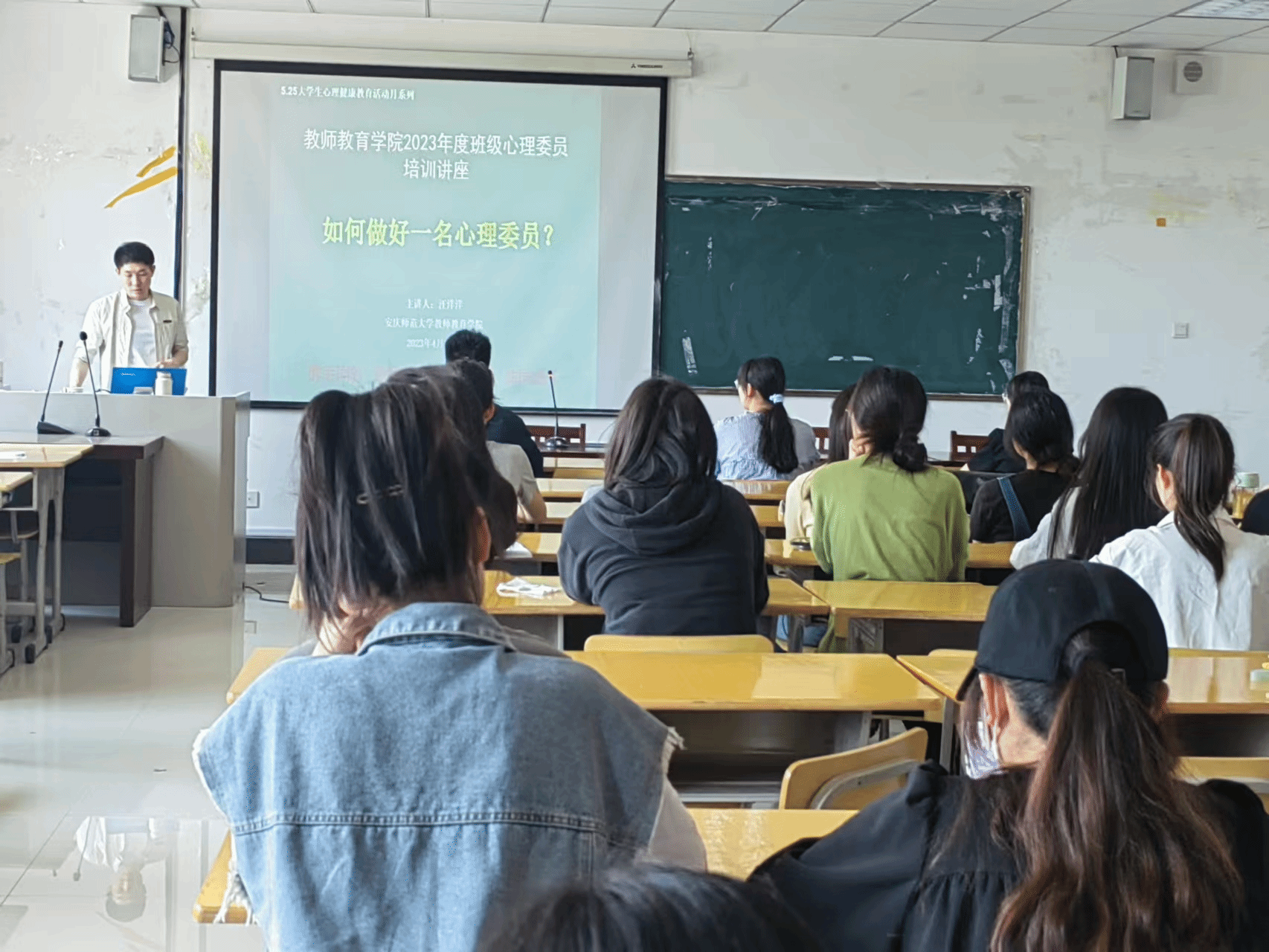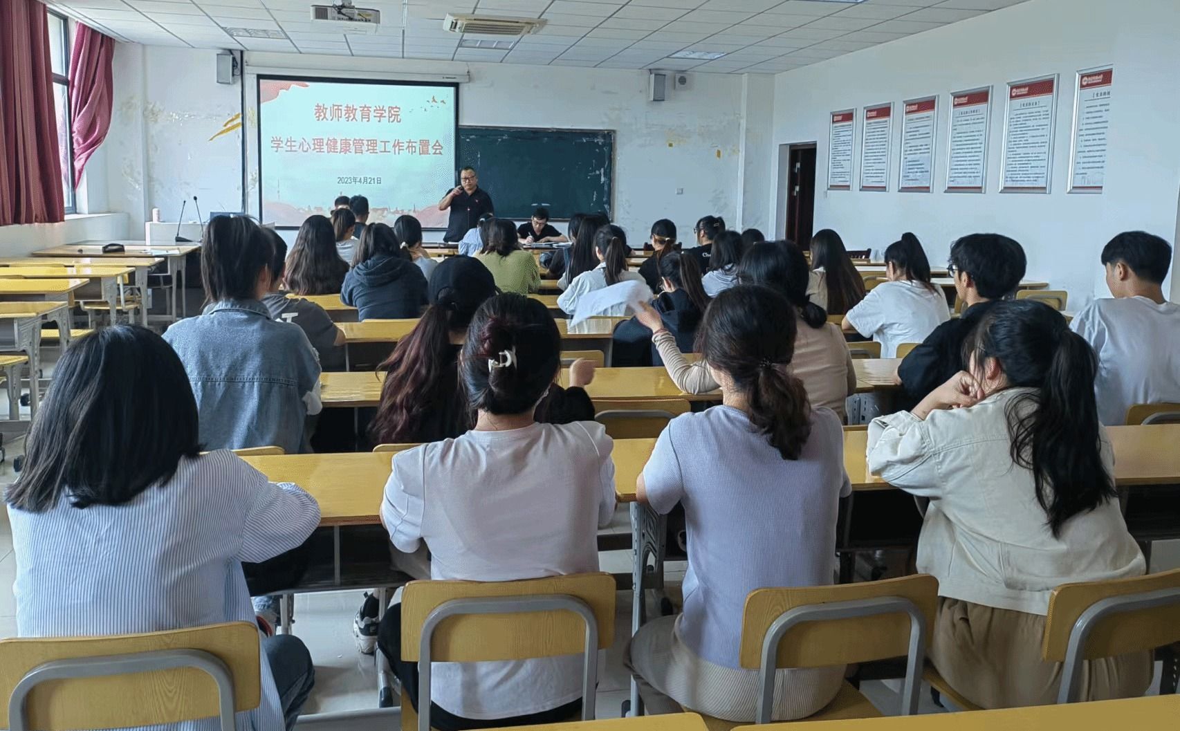 于J305开展学生心理健康教育管理工作布置会。此次会议由学院党委副书记许世平主持,院长吴云助讲话,心理健康专管老师汪洋洋对心理委员进行业务培训,学院全体各班级心理委员积极参加。