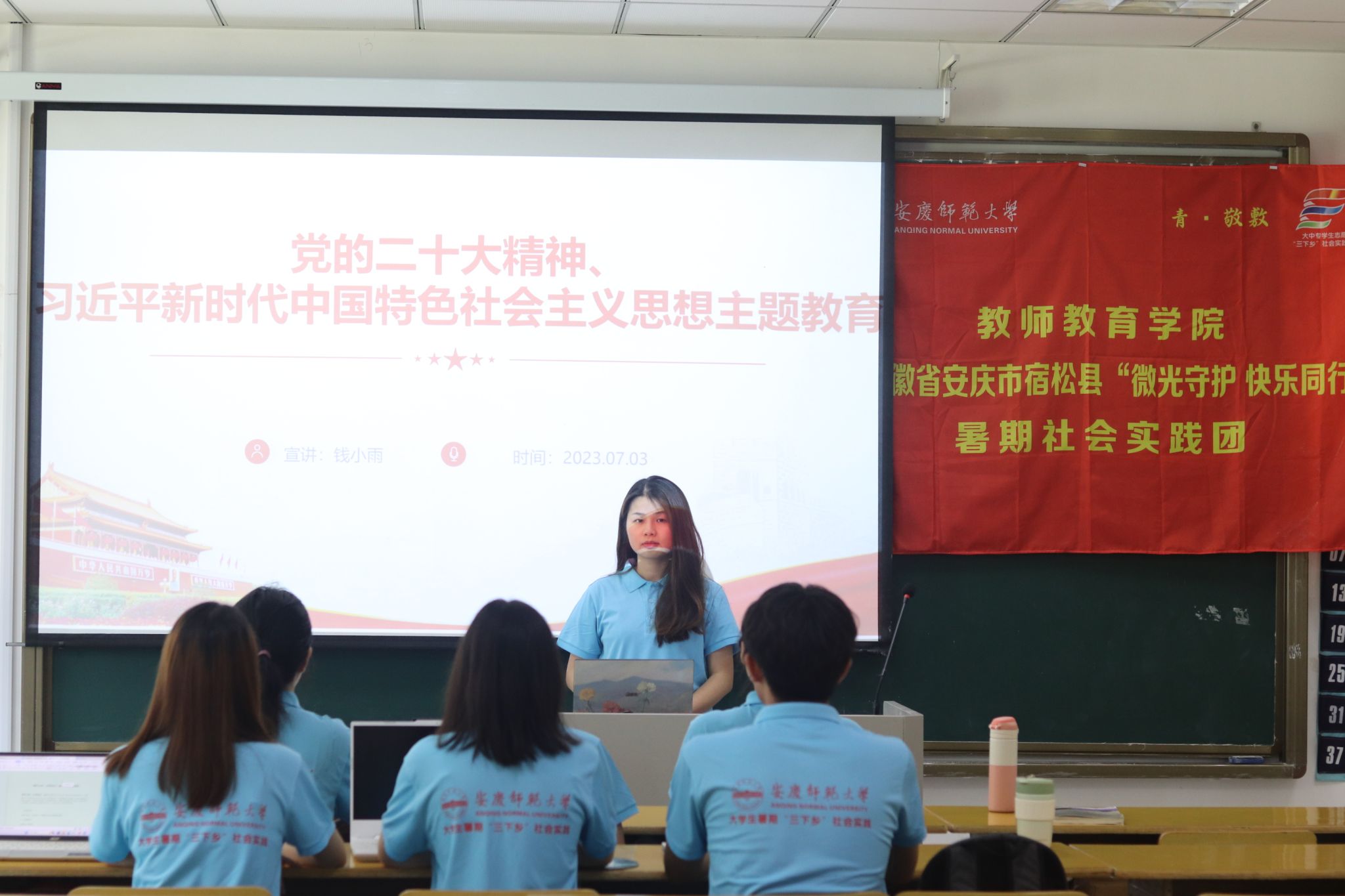 近日,教师教育学院“微光守护,快乐同行”暑期实践团为加强理想信念教育,深入学习贯彻习近平新时代中国特色社会主义思想主题教育,积极开展三下乡理论学习。