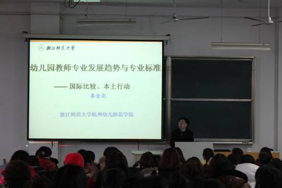 为国培班的幼儿教师作专题报告。报告题为“幼儿园教师专业发展趋势与专业标准——国际比较,本土行动”。 教育学院院长曹长德教授,高向东教授及全体国培学员和学前教育部分学生聆听了讲座。