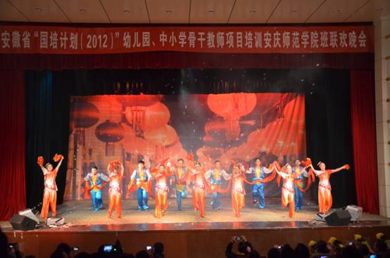 安徽省“国培计划”2012“幼儿园中小学骨干教师”项目培训安庆师范学院班联欢晚会于2012年11月28日晚在安庆师范学院音乐厅隆重举行。教育学院幼儿教师国培学员经过精心准备、苦心排练,参与了本次晚会的七个节目,占全部节目60%。全校国培学员欢聚一堂共享了一场艺术盛宴。