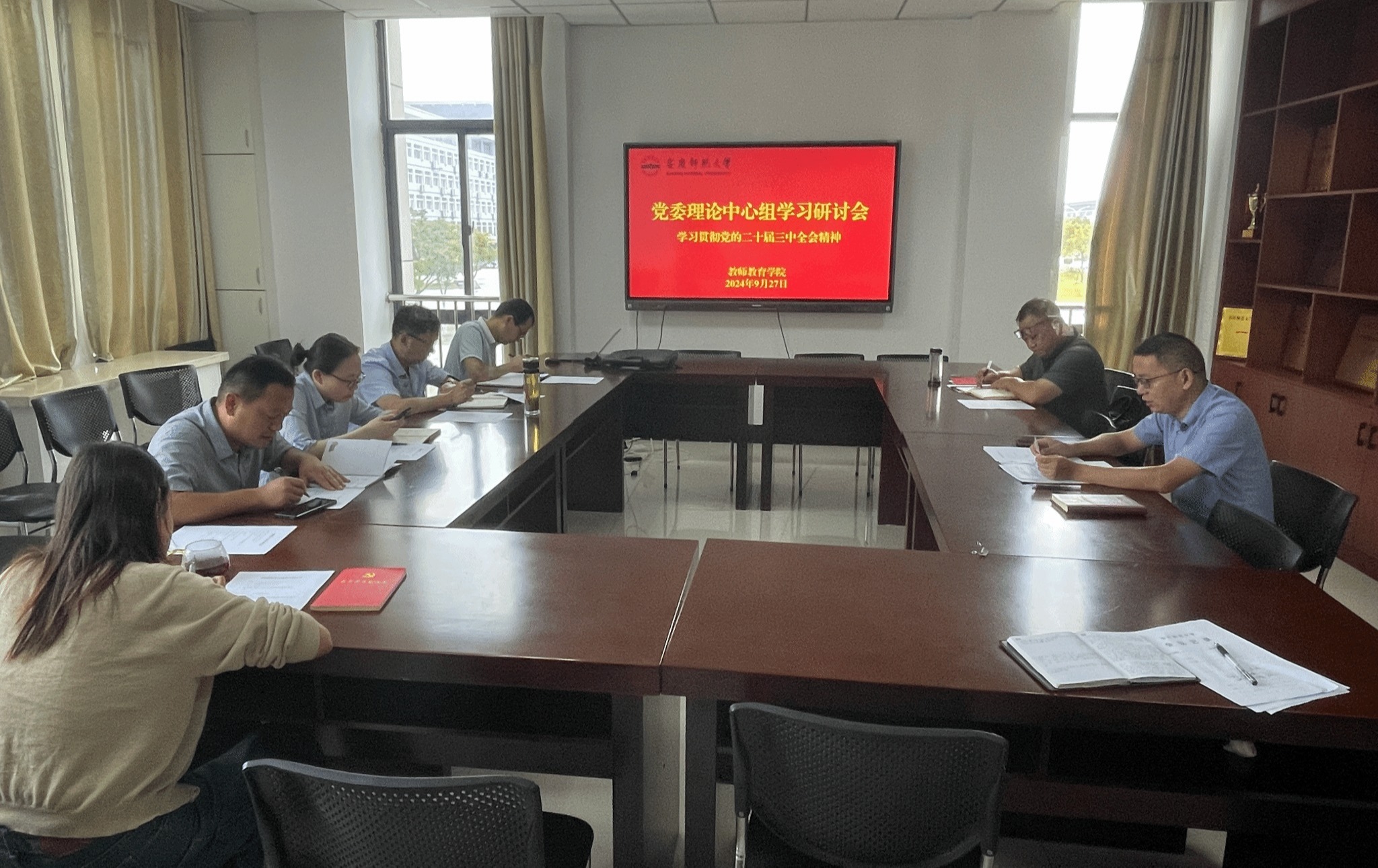 9月27日,教师教育学院党委理论学习中心组召开党的二十届三中全会精神专题学习研讨会。学院党委书记何孔蛟主持会议。会上,学院党委理论学习中心组成员何孔蛟、吴云助、王皓宇和支部书记代表姚强诚作重点交流发言。
