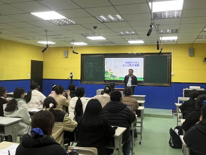 最后,江义林老师做题为《统编版小学语文文言文教学策略》的专题讲座。他提出小学语文文言文教学的五点策略:一是精细解读教材,体会表达秘钥;二是紧扣语文要素,定位教学目标;三是借助多样朗读,助力语感形成;四是找准读写结合点,实现读写共融;五是关注学生阅读基础,精心选择拓展内容。