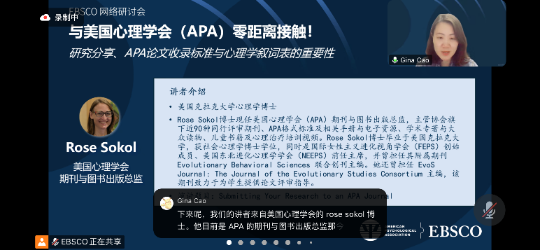 为深化国际学术合作,安庆师范大学心理学系宋志英教授携2023级应用心理与心理健康教育专业硕士研究生,于4月9日参加由EBSCO公司主办的"与美国心理学会(APA)零距离接触"线上国际会议。此次活动汇聚国内外心理学领域权威专家,围绕前沿研究、论文发表及数据库应用等核心议题展开深度交流。