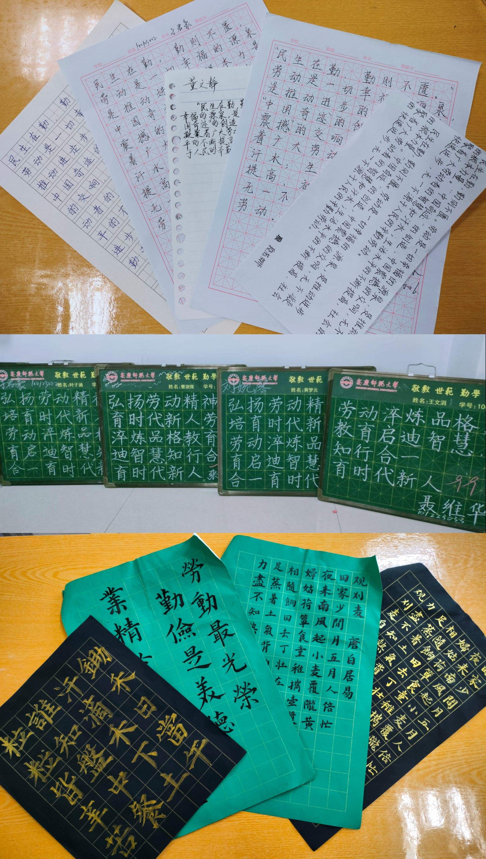 比赛现场,选手们全神贯注,挥毫泼墨。粉笔字组,选手们俯身凝神,白色粉笔在黑板上游走,起落间“劳动淬炼品格,教育启迪智慧”,一句句歌颂劳动的话语在笔下呈现,灵动秀逸,横竖撇捺间尽显功底。毛笔字组,墨香四溢,选手们铺开宣纸,蘸墨挥毫,行草隶篆各展风采。钢笔字组,选手们伏案疾书,墨水在纸上晕染开来,纸张上“民生在勤,勤则不匮。劳动是一切幸福的源泉”等语句在笔尖呈现,细腻的笔触尽显学生对劳动精神的理解。