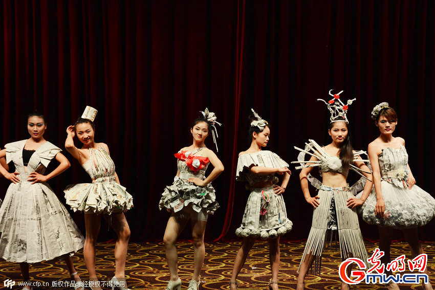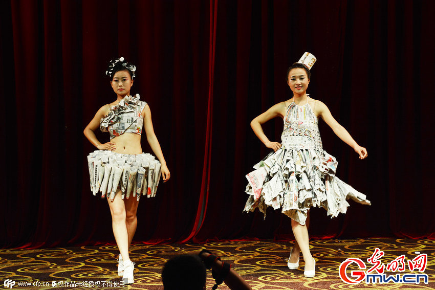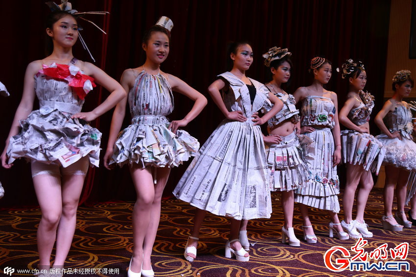 2015年05月14日,安徽省安庆市,安庆师范学院学前教育专业的学生上演创意手工服装秀,模特们身穿用废报纸和垃圾袋改造而成的晚礼服登台。