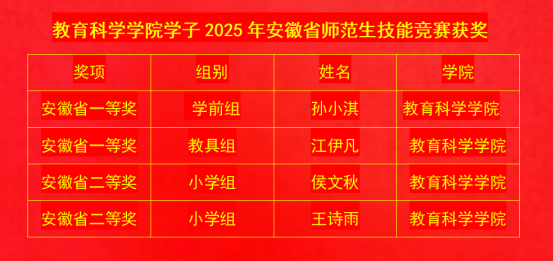 学子凭借扎实的专业功底与优秀的教学素养崭露头角,其中2023级学前教育专业(学前组)孙小淇、2023级特殊教育专业(教具组)江伊凡分别斩获一等奖;2023级小学教育专业(小学组)侯文秋、2022级小学教育专业(小学组)王诗雨分别荣获二等奖。