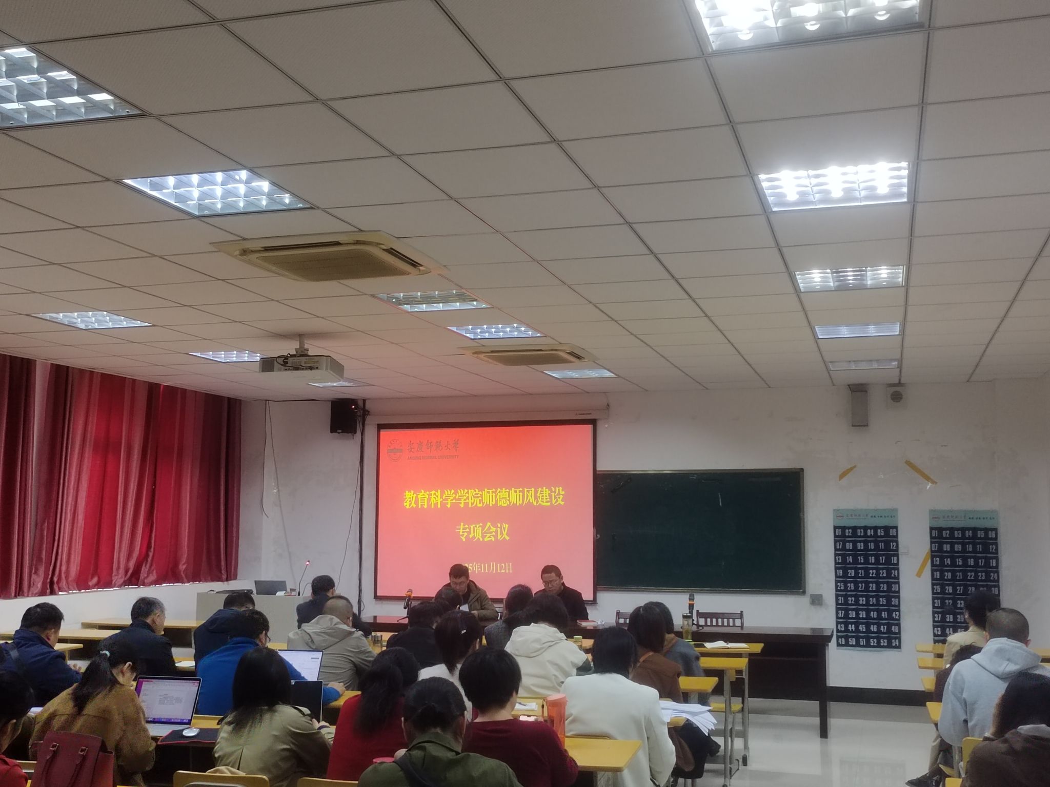 在J305会议室召开师德师风建设专项会议,学习习近平总书记关于教师队伍建设的重要论述,传达学校师德师风建设专项巡察动员部署会精神,通报违反师德师风典型案例,对学院开展的师德师风建设专项行动进行安排布置。学院领导班子成员、全体教职工参加会议。会议由学院党委书记何孔蛟主持。