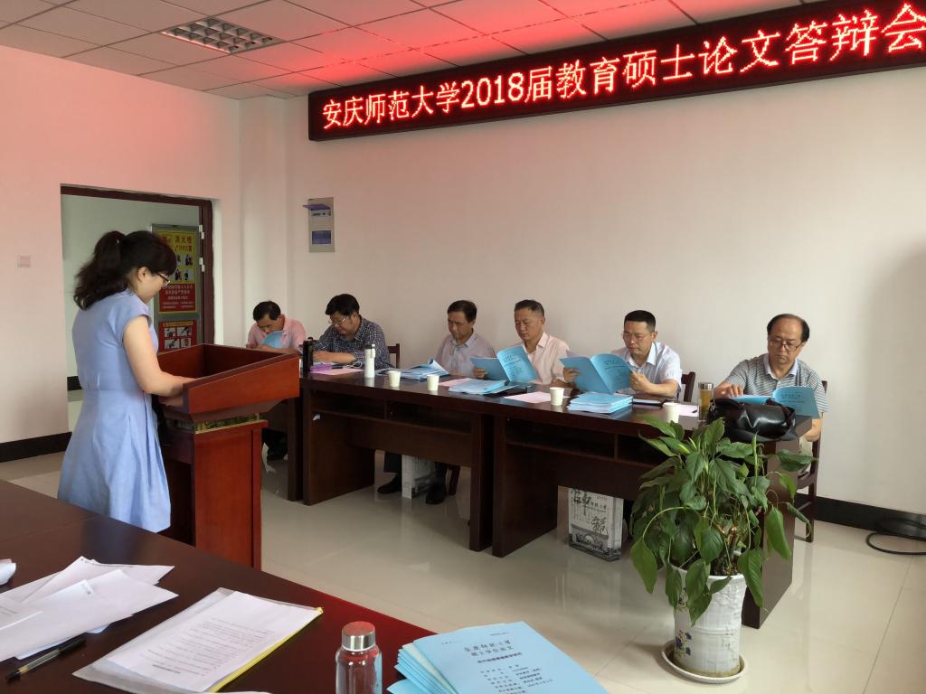 吴玲教授和合肥学院伍德琴教授担任本次答辩委员会主席,邀请安庆市教育教学研究室中学高级教师何成法和安徽省怀宁县小市初级中学的高级教师夏显亮担任答辩委员,硕士点导师曹长德教授、张理华教授、徐汪华教授、高向东教授、张祥稳教授、郭启华教授、宋志英教授、荀安华副教授、张启树副教授作为答辩委员会成员,小学教育、学前教育、学科教学(历史)、学科教学(数学)、学科教学(化学)、学科教学(地理)、学科教学(物理)、学科教学(音乐)的20名研究生参加答辩,部分2017级在读研究生旁听了本次答辩会。