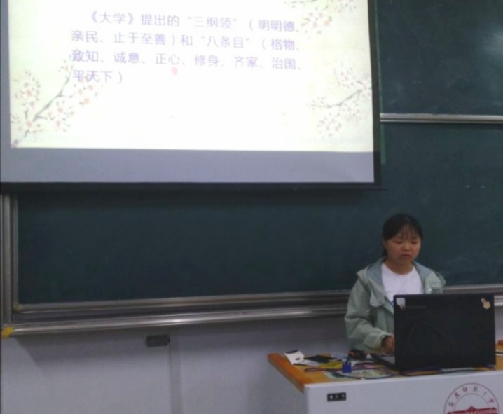 在报告会上,首先由梁彦、刘田利、王秀玉三位同学与大家分享了自己学习《大学》的感想。特别是王秀玉同学对“所谓齐其家在修其身者,人之其所亲爱而辟焉,之其所贱恶而辟焉,之其所畏敬而辟焉,……故好而知其恶,恶而知其美者,天下鲜矣。……不可以齐其家。”这段话感触颇深。她说,我们都是人,难免会“偏心”。但是作为一名未来的乡村教师,我们应该“正心”,教书育人,关爱学生,不放弃任何一名学生,公平公正对待每一位学生。