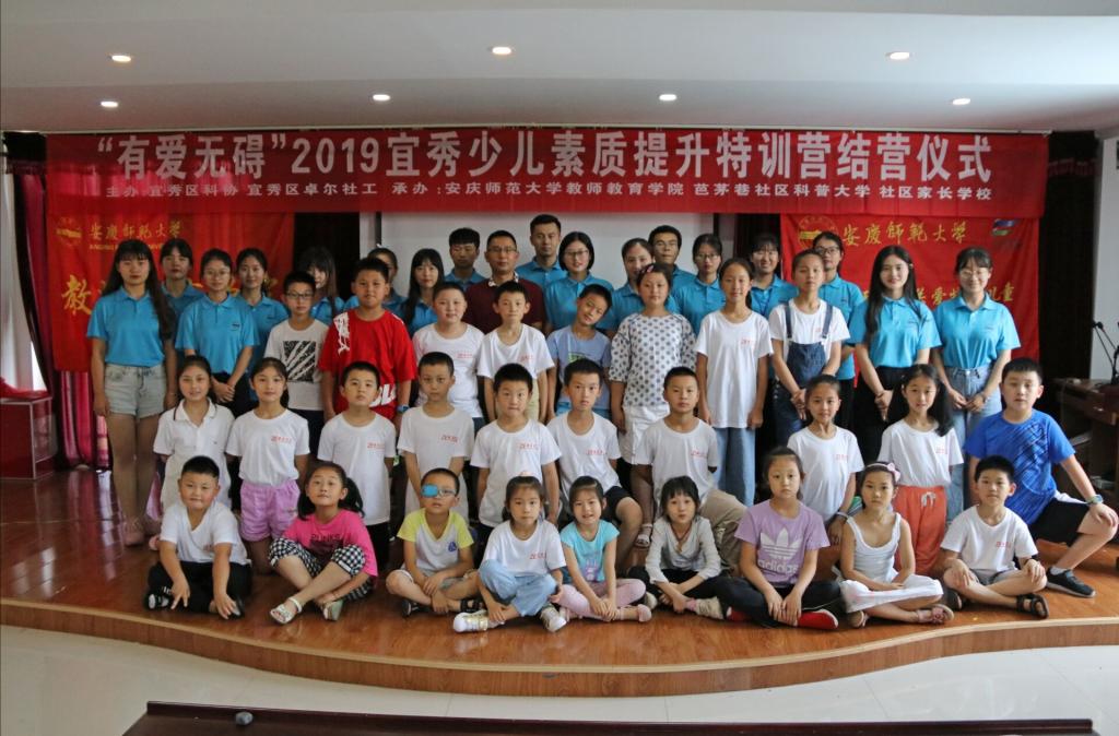 7月14日上午,经过为期七天的特训生活,“有爱无碍”2019年宜秀少儿素质提升特训营在安庆芭茅社区活动中心正式落下帷幕。宜秀区科协副主席李勇、安庆师范大学教师教育学院老师陈安定、芭茅巷社居委领导宣庆之、宜秀卓尔社工理事长王奎以及特训营的学生、家长、20名志愿者参加了此次结营仪式。
