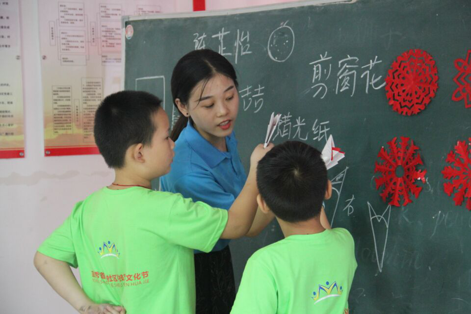 毛线除了能够织毛衣,还能用来做些什么呢?7月20日,今天是安庆师范大学“启智远航”教育实践服务团在芭茅巷社区进行社会实践的第六天,由来自教师教育学院的志愿者陈芷怡、胡诗梦担任老师,给孩子们上手工课。