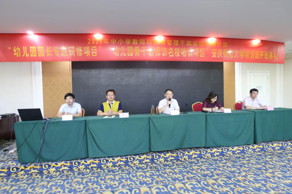 8月8日上午,安徽省(2019)教育管理干部和中小学教师省级培训计划“幼儿园园长专题研修项目”和“幼儿园骨干教师访名校培训项目”安庆师范大学培训班开班典礼在安庆英德利大酒店隆重举行。继续教育学院和教师教育学院负责人、项目团队成员以及来自全省革命老区和集中连片特殊困难地区的200余名普惠性民办幼儿园园长和幼儿园骨干教师参加了开班典礼。开班典礼由继续教育学院院长刘燕主持。