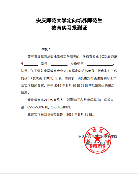 今年4月8日,教师教育学院向金寨县、岳西县、太湖县等50余生源地县(区)教育局发函对接教育实习工作。6月29日,在安庆举办第一届乡村小学全科教师培养研讨会暨安庆师范大学定向培养师范生教育实习对接会,校地双方详细会商了顶岗实习支教方案。7月4日,再次就做好教育实习的具体工作向各生源地县(区)教育局发函对接,落实了顶岗实习支教的岗位。7月5日至15日,教师教育学院完成了对全体定向培养示范生的实习培训和安全教育工作,并于开学前将实习生逐一派遣到生源地实习学校报到。