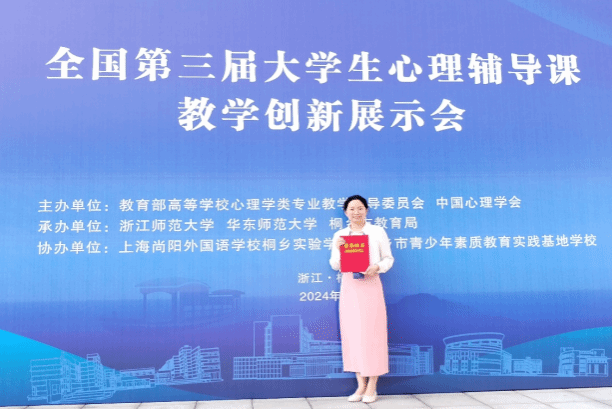 4月24日-26日,全国第三届大学生心理辅导课教学创新展示会在浙江省桐乡市举行。此次教学创新展示会由教育部高等学校心理学类专业教学指导委员会和中国心理学会主办,浙江师范大学、华东师范大学联合承办。经初赛评审,宋志英老师指导的2021级应用心理学专业刘洁同学入围决赛,并赴桐乡进行现场评比,宋志英陪同前往。