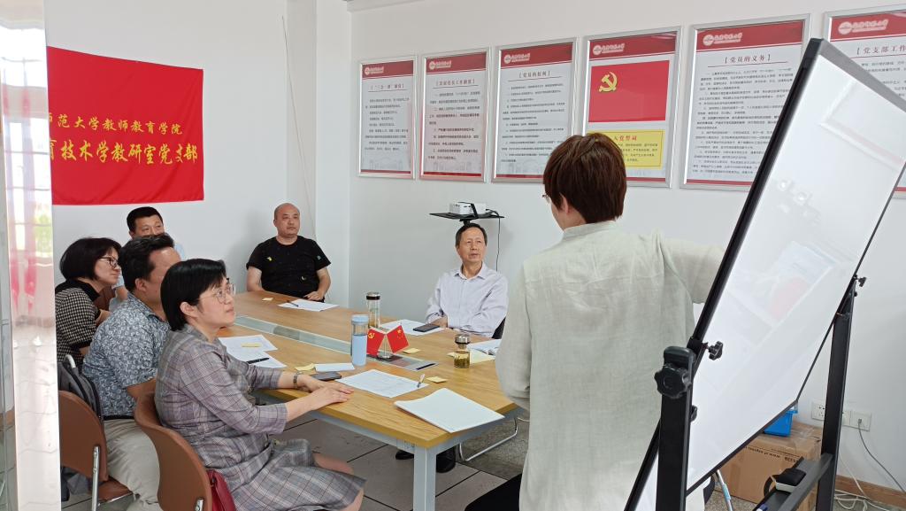 5月12日下午,教工教育技术学教研室党支部组织主题党日及教学研讨活动。专业负责人韩建华、教研室全体教师参加活动。活动分两个阶段,均由刘萌萌老师担任主持和主讲。
