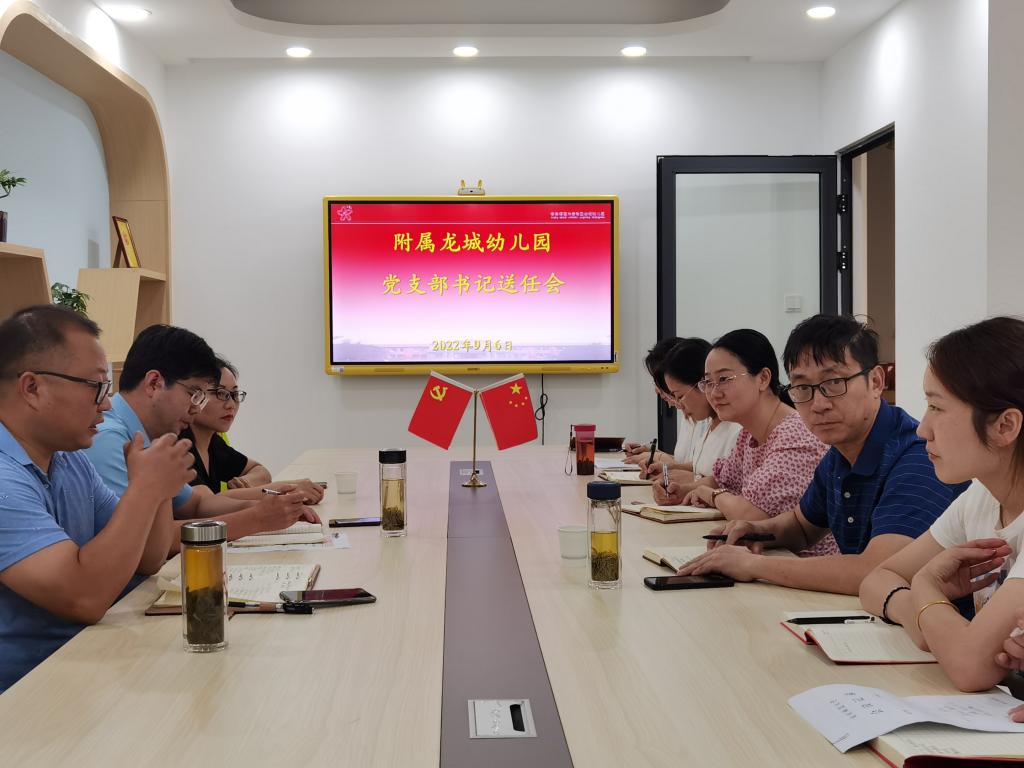 为强化党对教育工作的全面领导,实现学校党的组织和党的工作全覆盖,充分发挥基层党组织战斗堡垒作用和党员先锋模范作用,落实全面从严治党主体责任,9月6日上午,安庆师范大学附属龙城幼儿园举行党支部书记送任会。安庆师范大学教师教育学院党委书记陈志超,党委委员、执行院长吴云助,党委副书记、纪委书记许世平,党委委员、党委秘书唐凤霞,附属龙城幼儿园园长姚萍、后勤主任陈宗芳及党员教师参加会议。会议由陈志超主持。