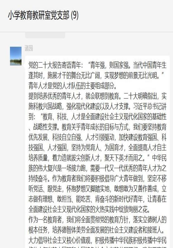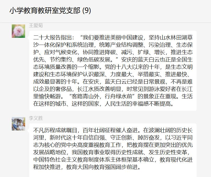 广大党员教师纷纷表示已经第一时间通过多种形式学习党的二十大精神,并将持续深入贯彻党的二十大精神。随后,每位党员教师结合自身本职工作、学习心得进行交流和讨论。(撰稿:王艳 审核:诸园)