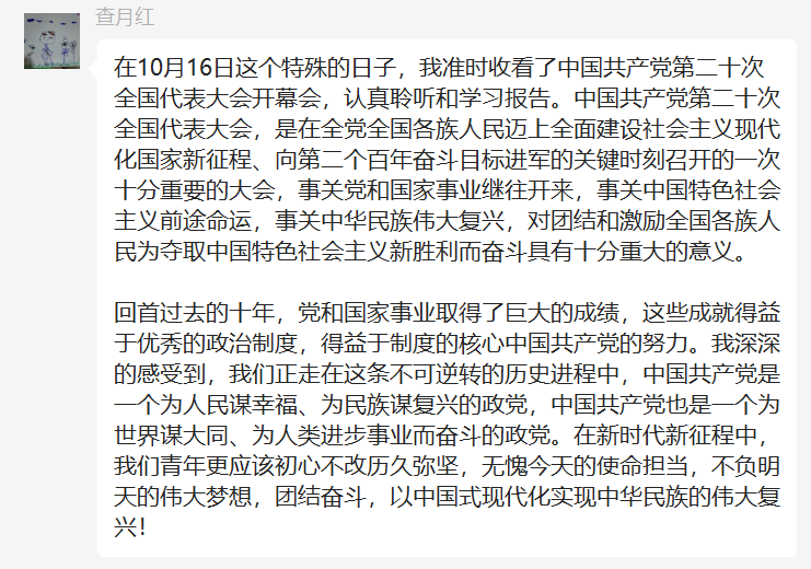 会上,全体党员教师一起学习习近平总书记代表第十九届中央委员会向大会作了题为《高举中国特色社会主义伟大旗帜 为全面建设社会主义现代化国家而团结奋斗》的报告。会议强调,中国共产党第二十次全国代表大会,是在全党全国各族人民迈上全面建设社会主义现代化国家新征程、向第二个百年奋斗目标进军的关键时刻召开的一次十分重要的大会,要将学习贯彻党的二十大精神作为当前最重大的政治任务,迅速掀起学习热潮,坚持多措并举,深学细研,入脑入心、学深悟透。