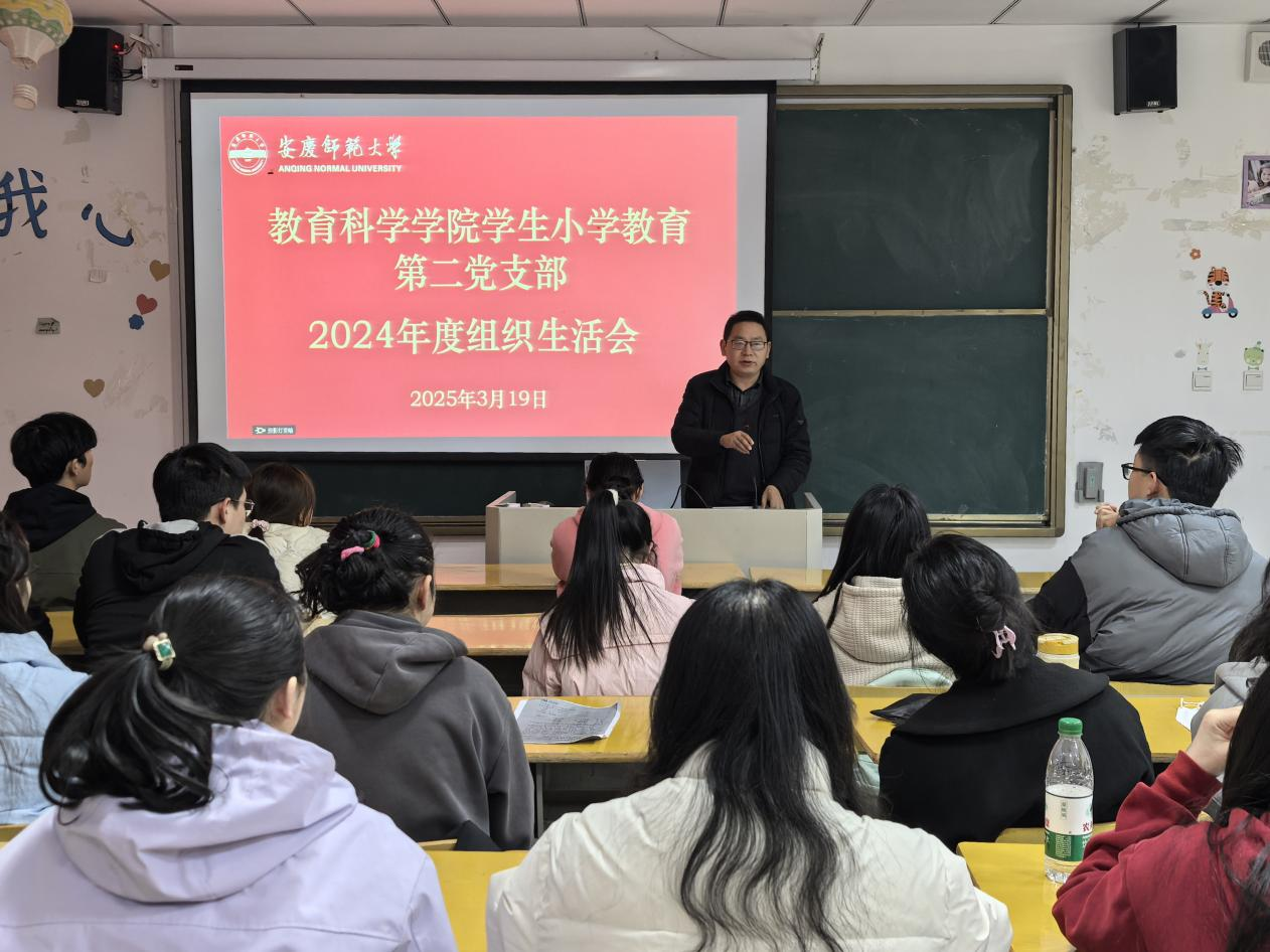 学生小学教育第二党支部在J214教室召开2024年度组织生活会。学院党委书记何孔蛟到会指导,学生小学教育第二党支部书记张文君主持会议。