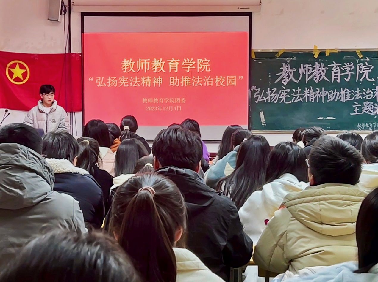 于J305教室开展“弘扬宪法精神,助推法治校园”主题活动。院团委实践委员叶伊林担任主持,学院八十余名学子到场参加。