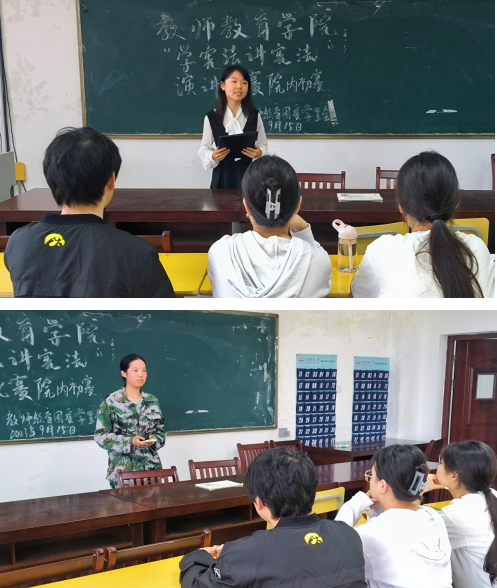 于J305教室举办“学宪法 讲宪法”演讲比赛院内初赛。院团委学生负责人袁畅、鲍雨蔷、熊远志等担任评委。