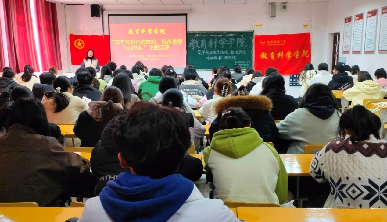 于J305教室举办“筑牢意识形态防线,校准思想行动航标”主题团课。院团委副书记姚强诚和团委学生副书记熊远志担任主讲,100余名学子到场学习。