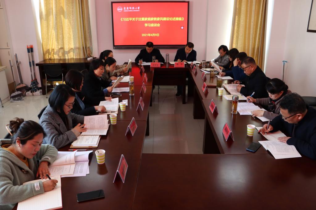 4月9日,安庆师范大学教师教育学院组织安庆家庭教育研究指导中心部分研究人员召开《习近平关于注重家庭家教家风建设论述摘编》学习座谈会,安庆市妇联主席焦玲、副主席张莉、快猫